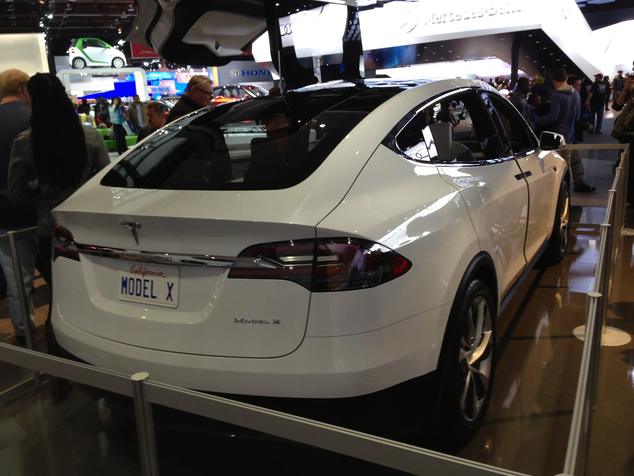 - Tesla Model X: This was my first time seeing the Model X in the metal, and it was worth the wait. It is just as impressive as the Model S it is based on, but looks smaller over all. I love the "falcon-wing" doors! Not sure how they would do covered in snow, afraid you might end up with a seat full of the white stuff. Access to the back seat looks great though, speaking of the back seat, it appears much roomier in person than in photos.